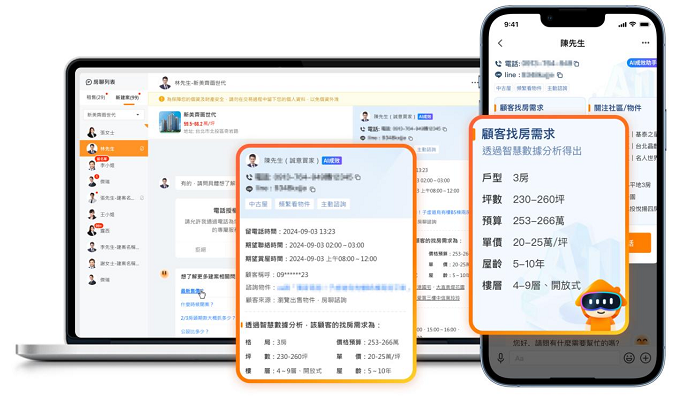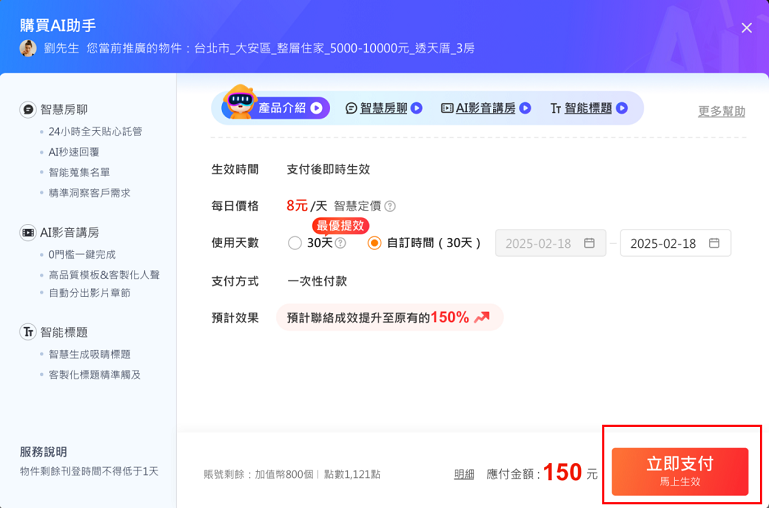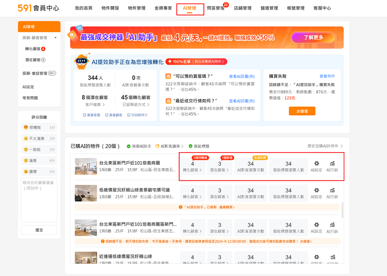 『AI提效助手』是一款“通過AI工具幫助聯絡成效提升”的加值服務產品,可通過購買這項服務,實現AI全天秒速回覆客戶疑問、自動獲取精準名單、精準洞察客戶需求;並且可以一鍵輕鬆生成高品質影片及客製化生成吸睛標題,從而提高物件點閱及聯絡機會,讓您的物件加速成交!