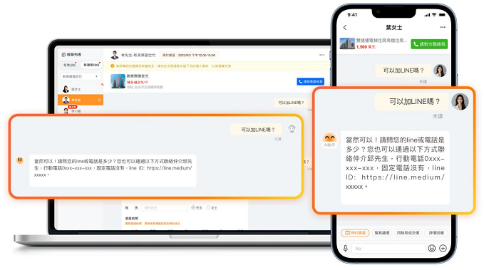 『AI提效助手』是一款“通過AI工具幫助聯絡成效提升”的加值服務產品,可通過購買這項服務,實現AI全天秒速回覆客戶疑問、自動獲取精準名單、精準洞察客戶需求;並且可以一鍵輕鬆生成高品質影片及客製化生成吸睛標題,封面在列表動態顯示,從而提高物件點閱及聯絡機會,讓您的物件加速成交!