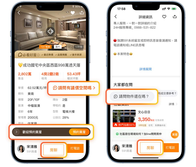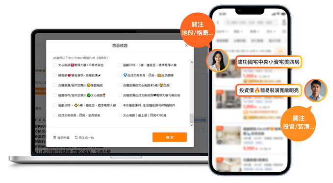 這項服務包含智慧房聊、AI影音講房、智能標題、列表頁動圖特權;通過24小時自動精準獲客、一鍵輕鬆生成高品質講房影音、以及客製化生成吸睛標題,列表動態展示封面吸引客戶注意,聯絡成效預計提升50%。