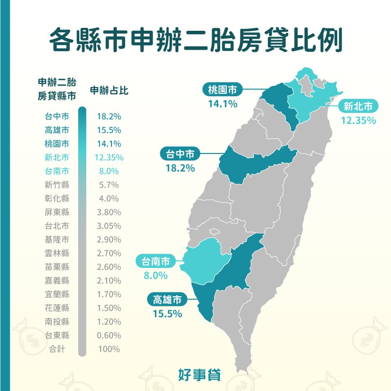 由下表的統計結果可以看出台灣17個縣市中,申辦二胎房貸地區以台中市居冠,其次依序為高雄市、桃園市、新北市以及台南市。