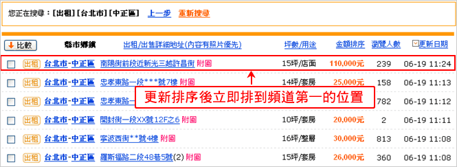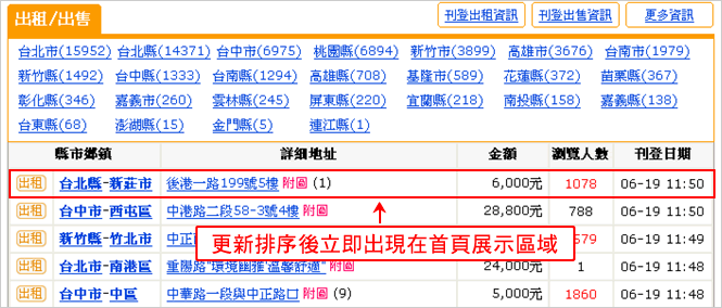 二、使用更新排序好處多多(如何更新排序) 1、物件短時間內排列在網站首頁和租屋頻道首頁,增加房客瀏覽數。